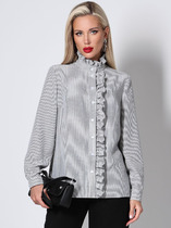 Рубашечный воротник на стойке. Фигурный низ и плавные разрезы по боковым швам. Изделие изнутри полностью окантовано.