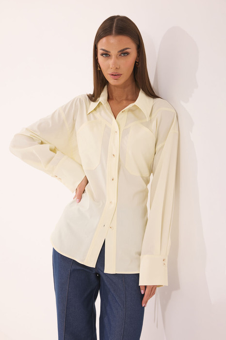 Блуза свободной формы, покроя спущенное плечо, с центрально бортовой застежкой на петли-пуговицы с отрезной планкой. Горловина оформлена стояче-отложным воротником с отрезной стойкой. Рукав двушовный снизу с двумя складками и широкой манжетой, застегивающейся на две пуговицы. Спинка цельная, в боковые швы вставлены петли, в которые втягивается шнурок для застегивания и создания драпировки. По переду кокетка и накладные карманы. Низ изделия фигурный.