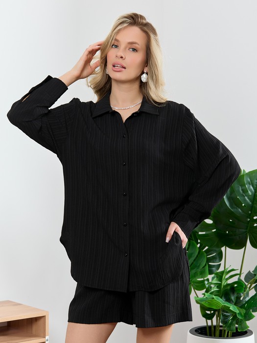 Рубашка женская из гладкокрашеного тканого полотна, свободного покроя, с длинными втачными рукавами, стояче-отложным воротником, фигурной линией низа и центральной бортовой застежкой на обметанные петли и пуговицы. Рукава – с притачными манжетами застегиваются на две обметанные петли и пуговицы.При выборе изделия в белом цвете идеальным решением будет выбор белья нейтральных