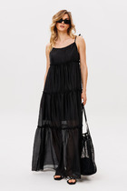 Подобно нераскрывшемуся бутону на тонком стебле, представленный сарафан создаёт неповторимый силуэт женской фигуре. Это достигается благодаря оригинальному крою юбки, а уравновешивает округлые формы низа – прямой и сдержанный лиф. Жатая текстура льна на этой модели, как элемент декора - соединяет воедино силуэтное разнообразие.