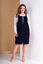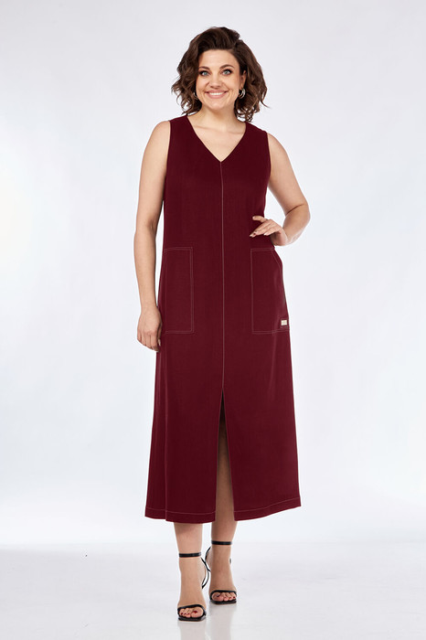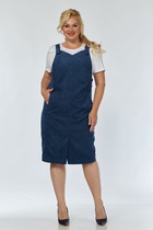 Сарафан женский А-силуэта из натуральной ткани. Горловина V-образной формы. По переду средний шов, нагрудные вытачки и обработаны накладные карманы. По низу разрез. Спинка со средним швом. Декором служат отделочные строчки, декоративная нашивка на кармане.