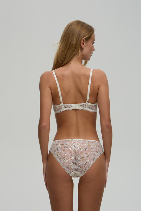 Бюстгальтер с формованными чашками triangle, с push-up во всех размерах, без каркасов, с боковыми корсетными вставками выполнен из нежного принтованного кружева. Нежная розочка украшает серединку переда. Бретели регклируемые не съемные.Застежка на 2 крючка и 3 ряда петель.