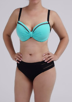 Раздельный купальник из эластичного полотна на подкладе с блеском с мягкой чашкой soft bra. Мягкая чашка со съемными формованными вкладышами.Бюстгалтер без каркасов и без боковых корсетных вставок Спереди декоративная завязывающаяся лента. Бретели регулируемые, не съемные. Металлическая застежка. Трусики с завышенной талией на подкладе. По бокам декоративные резинки из ткани купальника. Тонкая резинка, подгиб и плоский шов по талии и срезу ножек.