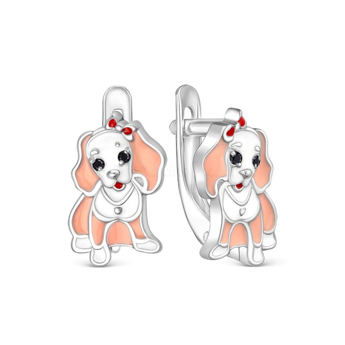 Серьги детские из серебра с эмалью и фианитами родированные - Собачки