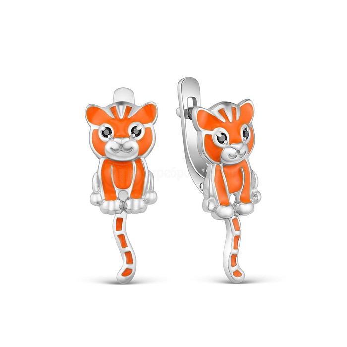 Серьги детские из серебра с эмалью и фианитами родированные - Тигрята