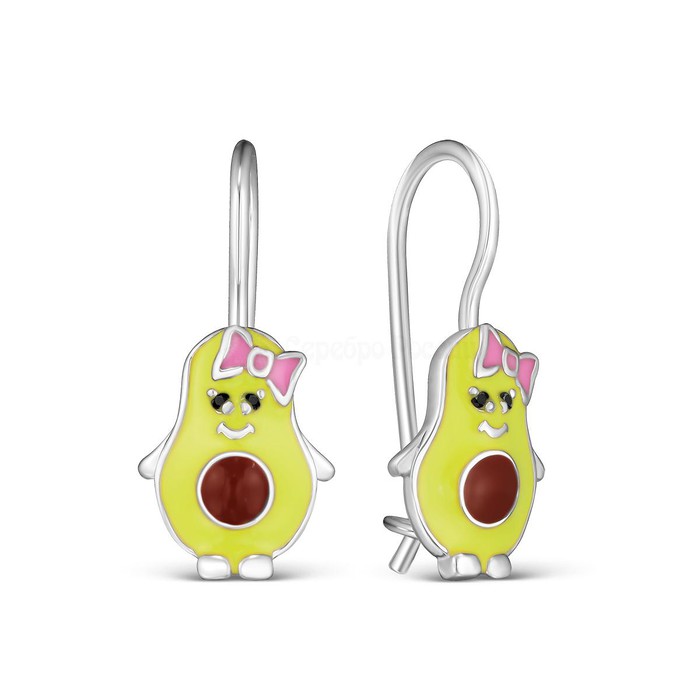 Серьги детские из серебра с эмалью и фиантиами родированные - Авокадо 925 пробы