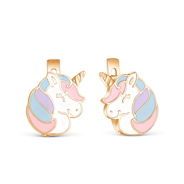 Серьги детские из золочёного серебра с эмалью - Единороги 6-00001зл