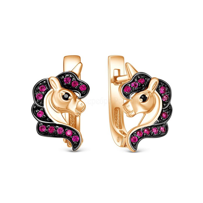 Серьги детские из золочёного серебра с корундом цв.рубин, фианитами и родировани