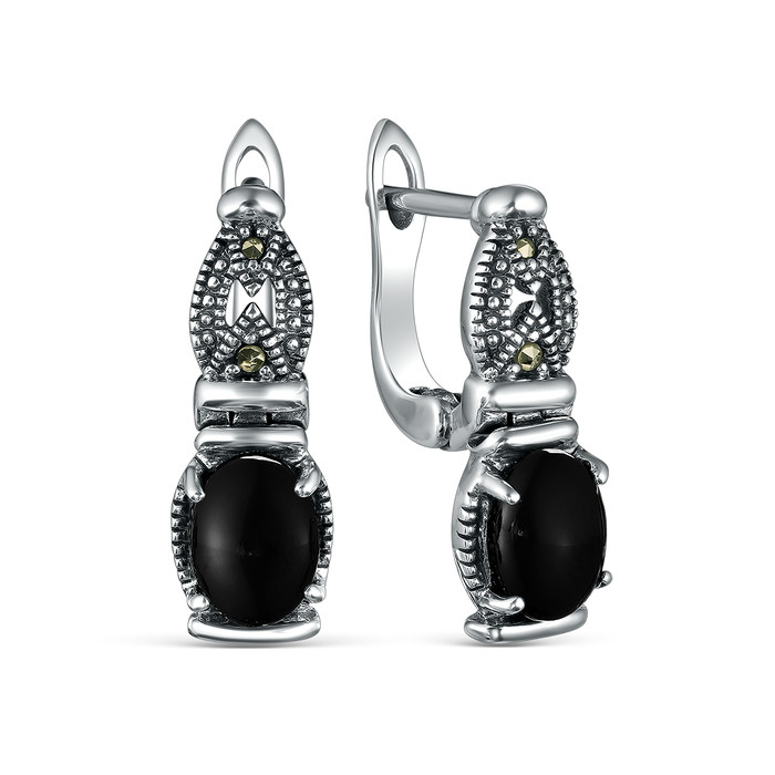 Совместные покупки Уфа Ювелирные украшения и бижутерия Серьги — Серьги из чернёного серебра с натуральным ониксом и марказитами 925 пробы HE0250