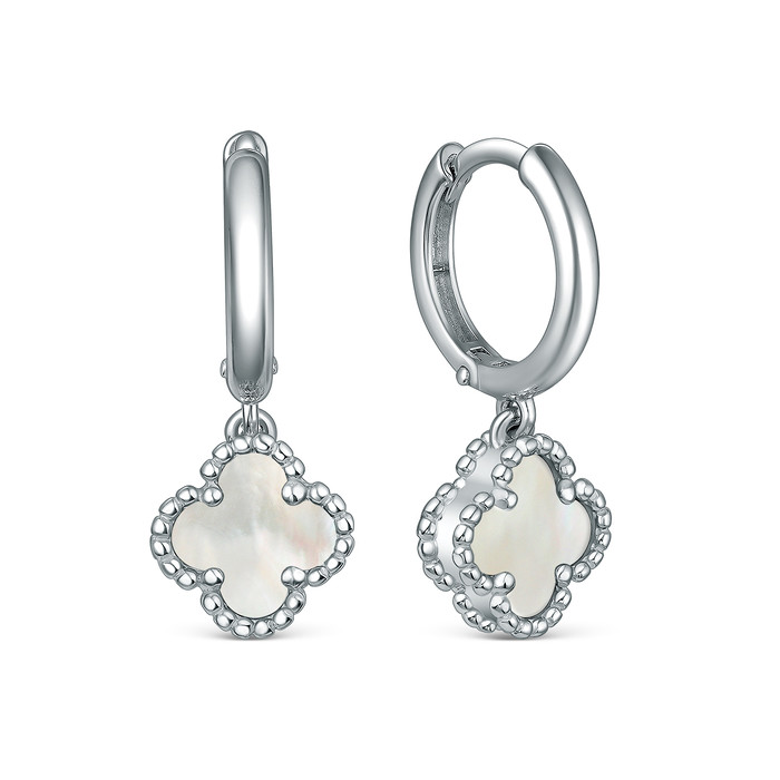 Серьги из серебра с белым перламутром родированные - Клевер, четырёхлистник 2-02