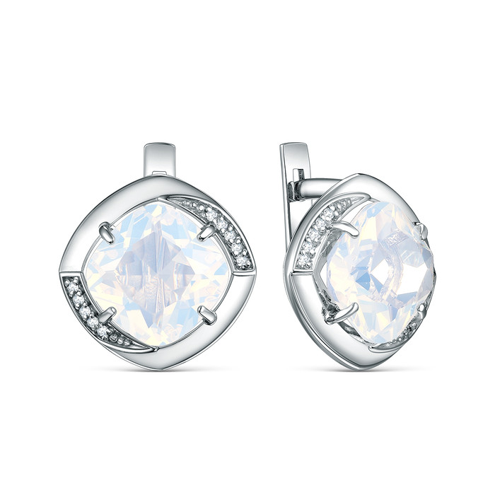 Серьги из серебра с плавленым кварцем цвета лунный молочный и фианитами родирова