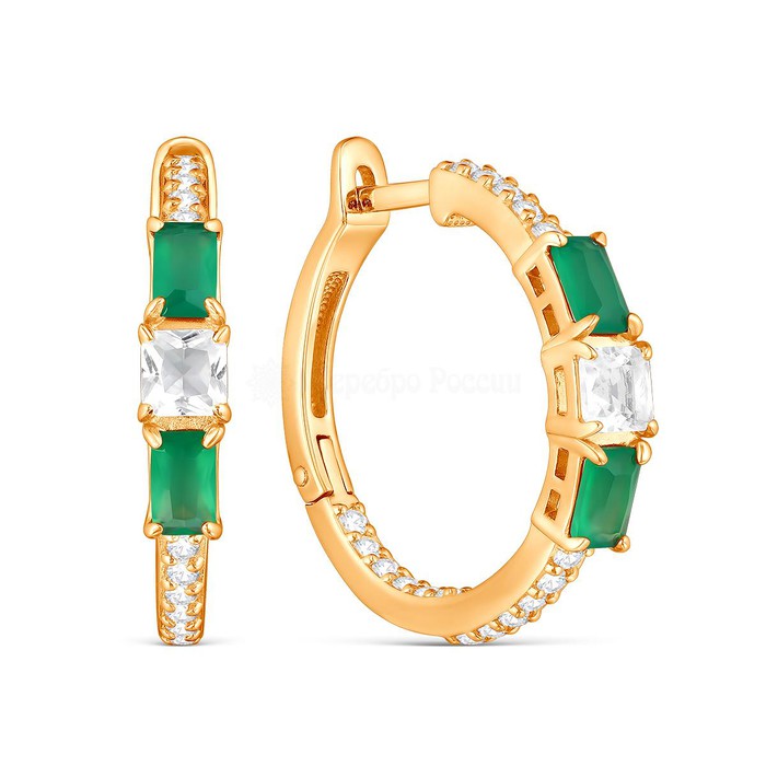 Серьги из золочёного серебра с натуральным зелёным агатом, натуральным горным хр