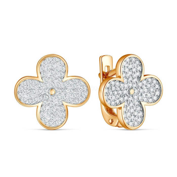 Серьги из золочёного серебра с родированием и фианитами - Клевер, четырёхлистник