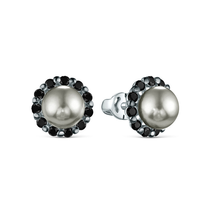 Серьги-пусеты из серебра с имитированным жемчугом и натуральной шпинелью родиров