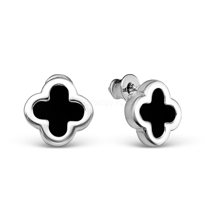 серьги-пусеты в форме клевер гвоздики из серебра с камнем оникс родирование колл