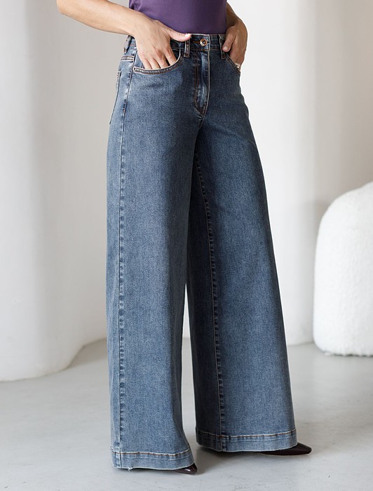 Широкие джинсы с декоративной стиркой из эластичного плотного денима