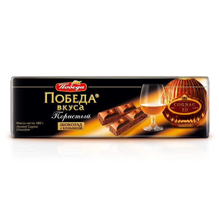 Десертный шоколад «Победа» отличается повышенным содержанием какао-бобов особой мягкой обжарки (50 %). Благодаря пористой структуре этот шоколад просто тает во рту, а его насыщенный и глубокий вкус великолепно сочетается с классической для шоколада добавкой – согревающей ноткой коньяка.