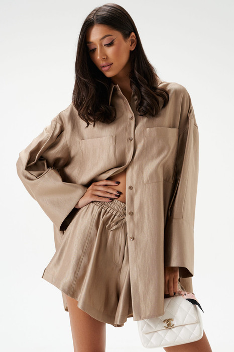 Шорты свободного кроя. Выполнены из текстильного полотна. Характеристики: пояс на резинке с кулиской, карманы-хулиганы, по передней и задней части вертикальные швы, в боковых швах разрезы 4см. Длина изделия по боковому шву 35 см.
