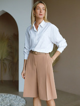 Шорты свободного кроя. Выполнены из текстильного полотна кофейного цвета в полоску. А-силуэт. Пояс на резинке. По передней части имитация застежки на 3 пуговицы. Карманы-хулиганы. По передней и задней части вертикальные швы. Длина 37 см