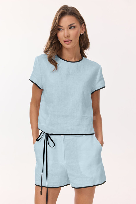 Шорты льняные короткие, на притачном поясе со шлёвками, в которые втянут шнурок из льна контрастного цвета, застежкой-гульфик. Пояс застегивается на петлю-пуговицу. По переду карманы от бокового шва. По спинке вытачки от пояса. Низ шорт окантован льном контрастного цвета. Шорты без подкладки.