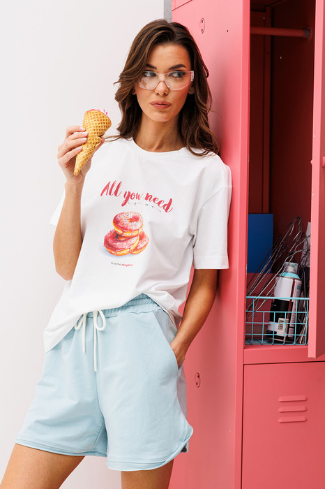 Шорты спортивные, короткие. Пояс притачной, отстрочной на резинке с втянутым в него декоративным шнурком. По переду карманы в боковых швах с нахлонным входом в него. По низу шорты с притачной планкой с необработанным краем и закруглением к боковым швам.