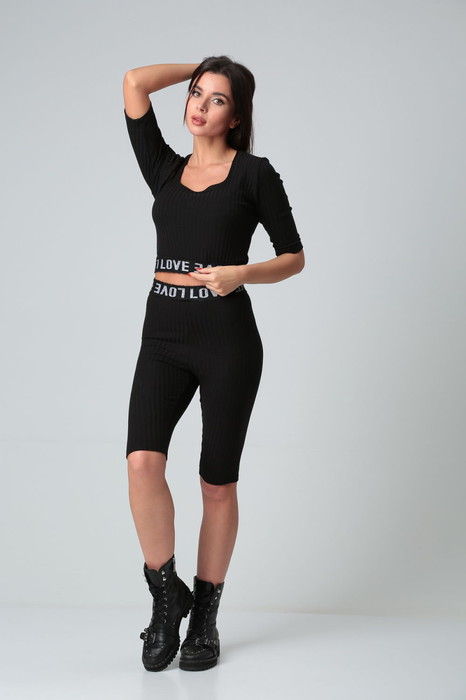 Шорты из трикотажного полотна длиной до колена пррилегающего силуэта. По талии декоративная эластичная лента.