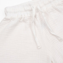 Шорты для девочек свободного силуэта из ткани. Посадка высокая. На детали переда карманы с отрезным бочком. Пояс отрезной с эластичной тесьмой RV40 внутри, на поясе пробиты петли и вставлен шнур из основного полотна. Шов втачивания пояса распошит. Длина выше колена. Низ обработан швом вподгибку с закрытым краем.