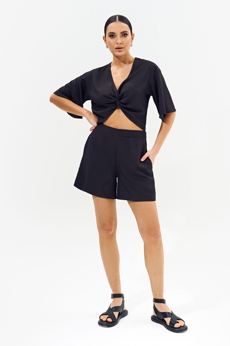 Базовые женские шорты полуприлегающего силуэта с завышенной линией талии выполнены из легкой струящейся ткани. По переду функциональные карманы, притачной пояс по спинке полностью на резинке для лучшего прилегания.
