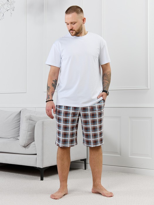 Шорты мужские из трикотажного полотна "кулирка" в клетку, свободного покроя, на притачном поясе с эластичной тесьмой внутри, с карманами в боковых швах. Нижние срезы обработаны подгибкой.