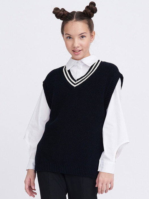 Стильный вязанный жилет унисекс с V-образным вырезом из хлопковой пряжи прямого фасона. Боковые швы дополнены разрезами. Низ жилета, пройма рукавов и вырез горловины оформлены фактурной резинкой, вдоль горловины резинка контрастного цвета. Жилет выполнен из 100% хлопка, что обеспечивает отличную воздухопроницаемость и комфорт в повседневной носке.