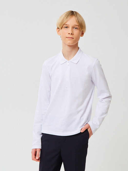 Поло из 100% хлопка с длинными рукавами и отложным воротником рубашечного типа, с центральной укороченной застежкой по переду на молнии.