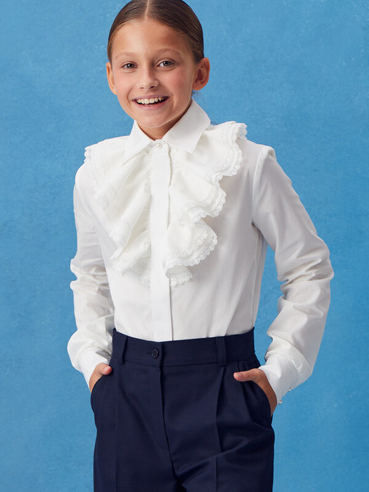 Романтичная блузка из смесового хлопка полуприлегающего силуэта с отложным воротником-стойкой и длинными рукавами на манжетах. Блузка дополненна объемным жабо и манжетами украшенными кружевом. Блузка идеально подходит для торжественных случаев. Высокое содержание хлопка в составе обеспечивает отличную воздухопроницаемость и комфорт в повседневной носке.