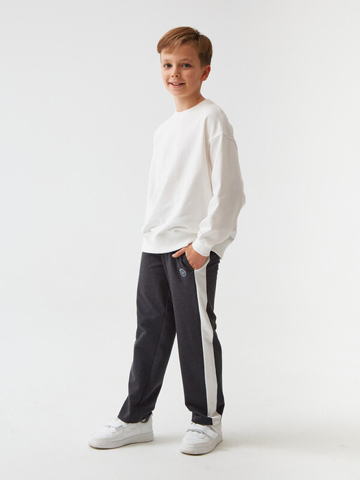 Спортивные брюки прямого силуэта выполнены из мягкого трикотажного полотна, что делает их комфортными для повседневной носки. Эластичный пояс без застежек обеспечивает удобную посадку, а стильный принт на передней части добавляет оригинальности. В боковые швы аккуратно втачаны трикотажные лампасы, которые придают модели модный акцент. Функциональные карманы оформлены декоративной строчкой с закрепками на концах для надежности и долговечности. Такая модель отлично подойдет для активного дня и учебных занятий благодаря сочетанию практичности и стиля.