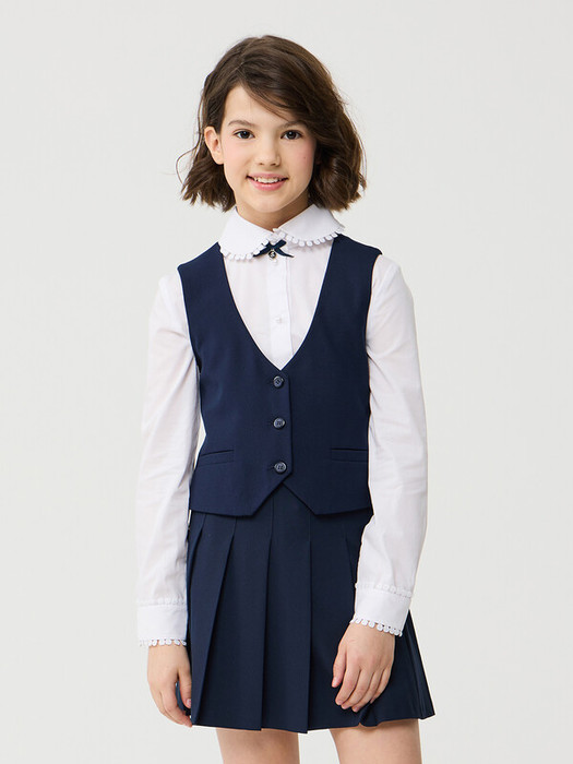 Трикотажный жилет на подкладке для девочки. Полочки дополнены двумя прорезными карманами с листочкой. На спинке два рельефных шва. Застегивается на 3 пуговицы. Жилет будет прекрасным дополнением к моделям из школьной коллекций SMENA, отличный вариант на каждый день