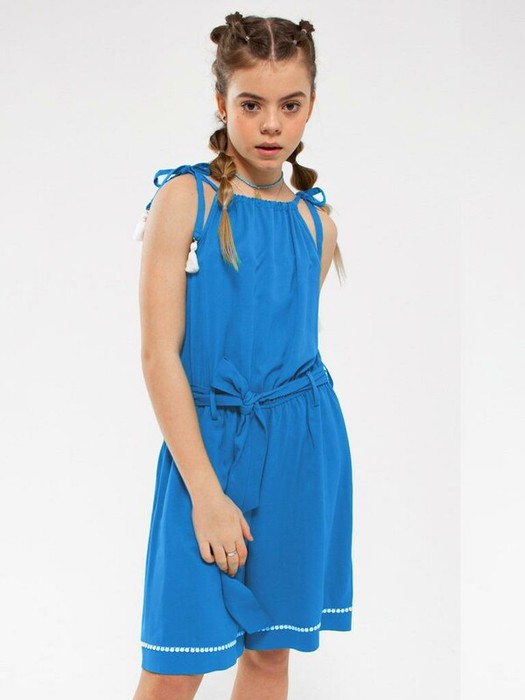 Полукомбинезон из струящейся вискозы. Бретели завязываются на плечах и декорированы тканевыми кисточками. Талия на резинке со шлевками и поясом из основной ткани, завязывающимся на бант. В боковых швах карманы.