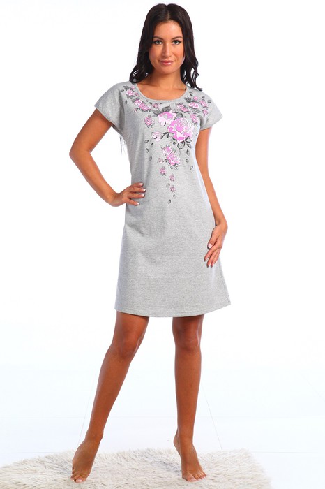 Сорочка из кулирки. Короткие рукава, принт в виде цветов. Два варианта расцветки — ментоловая и серая. Общая длина чуть выше коленей. Размеры от 42 до 60. Имеется возможность заказать данный товар по розничной цене.