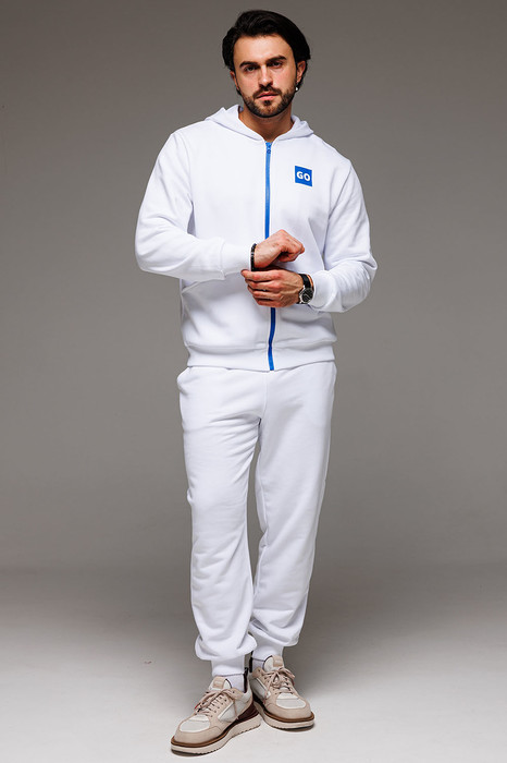 Яркий повседневный мужской спортивный костюм из комфортной ткани (футера без начеса), который подойдёт для дома, прогулок, путешествий и просто отдыха. Состоит из худи с контрастной застежкой молнией и брюк-джоггеров.