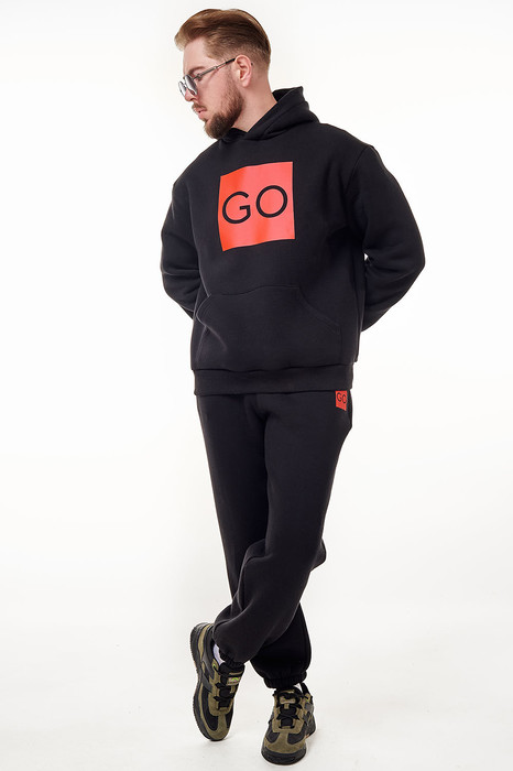 Костюм комфортный покроя oversize, спортивного стиля из комфортной ткани (футера с начесом). Костюм состоит из худи и брюк. Худи прямого силуэта, с притачной манжетой по низу изделия. Худи имеет двойной капюшон и карман - кенгуру. На переде контрастная печать GO. Рукава втачные с манжетой. Брюки с притачным поясом с резинкой и шнурком внутри. Передняя половинка брюк с боковыми карманами. Низ брюк присобран на резинку.