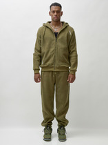 Спортивный костюм из плотного хлопкового трикотажного полотна с изнаночным начесом. Куртка на поясе с воротником, застегивается на молнию. Рукава втачные. Куртка скомбинирована из двух видов полотна, с контрастными рукавами. Яркость изделия подчеркивает клубная вышивка на груди и использование полосатого полотна для пояса, воротника и манжет куртки. Карманы куртки и брюк прорезные, с молниями . Брюки по низу заужены манжетами.Брюки прямого силуэта.Пояс брюк эластичный, по линии талии дополнительно регулируется шнурком.