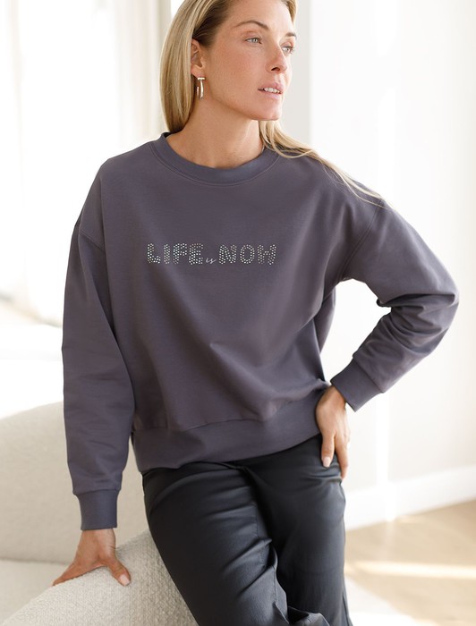 Состав: 75%Хлопок 20%ПЭ 5%ПУ Плотность: 260 Г/м2 Параметры модели на первом фото: Рост 172, бюст 88, талия 64, бедра 88Свитшот выполнен из эластичного футера двухнитки. Изделие дополнили аппликацией из металлических страз. Перевод: Life is now - живи сейчас. Расслабленный стиль поддерживает спущенная линия плеча, свободный силуэт и разрезы по бокам. Модель сочетается в костюме с брюками D44.135, D44.136, D44.137 и юбкой D46.034
