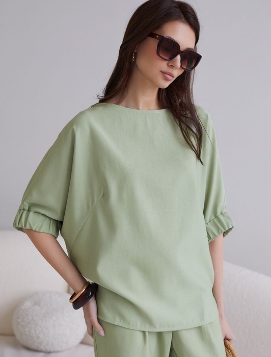 Состав: 76%Лиоцелл (Вис) 24%ПЭ Плотность: 180 Г/м2Свободная блузка светло-зеленого цвета выполнена из плотного лиоцелла. Лиоцелл это более дорогой и экологичный вариант вискозы, очень прочный и шелковистый. Современная интерпретация кроя «летучая мышь» дополнена акцентными эластичными манжетами. Эта блузка идеальна для любого типа фигуры, в том числе и на королевские размеры. Этот крой создан для того, чтобы мягко скрыть лишние объемы. Эта повседневная блузка с вырезом лодочка создана для легкого и утонченного стиля. Мягкие линии кроя создают невероятно эффектный образ, который подчеркивает естественную красоту, не стесняя движений, а свободный фасон дарит ощущение абсолютного комфорта и уверенности. Блузка красиво драпируется при движении, создавая летящий, воздушный эффект.