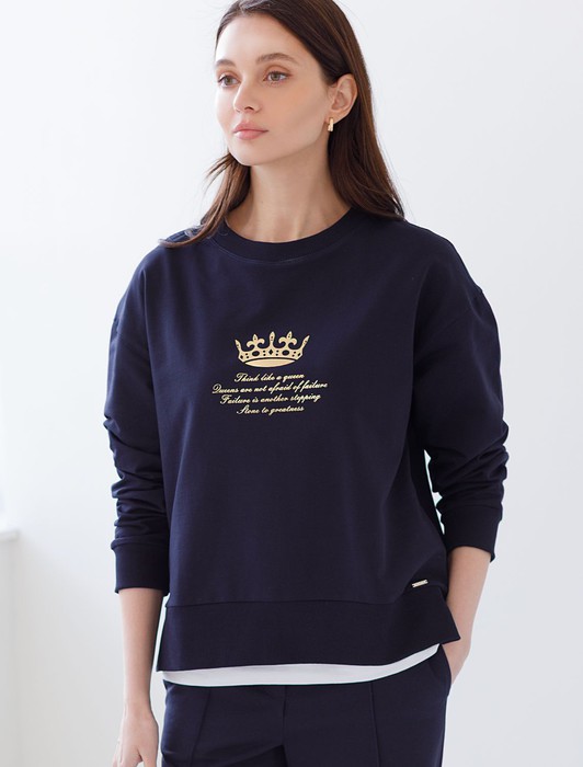 Состав: 95%Хлопок 5%ПУ Плотность: 240 Г/м2Стильный свитшот темно-синего цвета из премиального футера двухнитки с эластаном сочетает в себе комфорт и оригинальность. Джемпер выполнен из натурального хлопка, который обеспечивает мягкость и дышащие свойства ткани. Нежный материал дарит ощущение уюта в любое время года, а премиальное качество изготовления гарантирует долговечность и сохранение формы после множества стирок. Особенность изделия — спущенная линия плеча и аккуратные разрезы, которые добавляют современный акцент и делают образ более выразительным. Принт в виде надписи придает индивидуальность, позволяя выделиться без лишней вычурности. Перевод надписиThink like queen Queens are not afraid of failure Failure is another stepping Stone to greatness - Думай как королева Королевы не боятся неудач Неудача — это ещё один шаг К величию. Дополнен металлическим логотипом бренда. Представлена широкая размерная линейка, включая маленькие и большие размеры, что позволяет подобрать идеальный вариант для разной фигуры и роста. Этот уютный свитшот отлично подходит для повседневной носки благодаря своей комфортной посадке и мягкой текстуре. Он станет универсальным элементом гардероба, легко сочетающимся с различными стилями одежды. Свободный джемпер из футера станет отличным выбором для активного отдыха, обеспечивая стильный внешний вид и удобство весной, летом или в прохладную погоду.