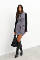Жилет молодежный из трикотажного полотна «дабл-флис» (двухсторонний флис), прямого силуэта, с воротником «стойка», центральной бортовой застежкой на тесьму «молния». Для создания диагональных линий боковые швы переведены на полочку и оформлены в рельефные швы, в которых обработаны карманы.