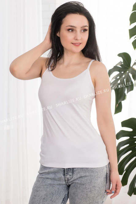 Белый базовый топ на тонких бретелях, прилегающего силуэта выполнен из качественной вискозы и станет незаменимой вещью в вашем гардеробе.