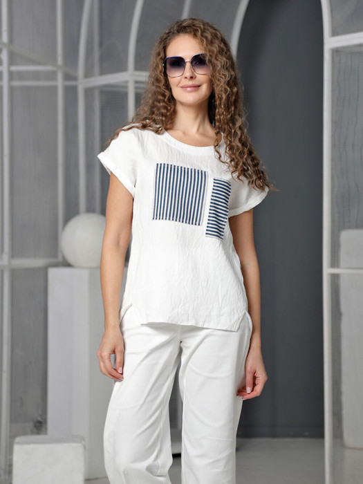 Стильная блуза из мягкой вискозы прямого силуэта с короткими цельнокроеными рукавами подходит для девушек и женщин разных возрастных групп. Оригинальная аппликация из принтованного льна и разноуровневая линия низа с декоративными разрезами акцентируют модный стиль блузки. Она хорошо сочетается со всеми брюками, жакетами и рубашками из нашей летней коллекции. Выбирайте понравившийся цвет, подбирайте обувь и аксессуары, и эта блуза выручит Вас летним днем в городе, на прогулке и на отдыхе. Собирайте свои образы, дополняйте их яркими аксессуарами и наслаждайтесь комфортом в летние дни!