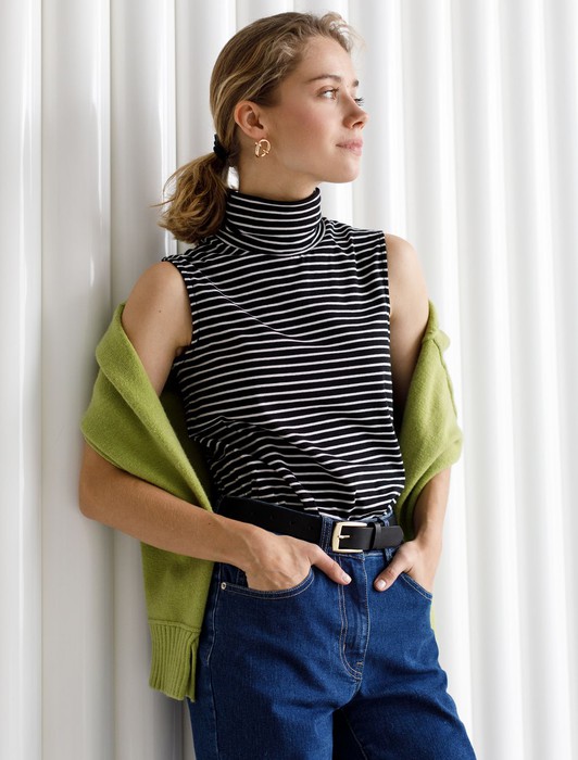 Состав: 92%Хлопок 8%ПУ Параметры модели на первом фото: Рост 170, бюст 89, талия 63, бедра 92Топ с воротом как у водолазки выполнен из премиального хлопка. Наличие эластана в составе изделия способствует формоустойчивости. Модель хорошо будет сочетаться в комплекте с жакетом или кардиганом, так как отсутствие рукавов позволит комфортное использование в многослойных образах. Из украшений металлический логотип бренда.
