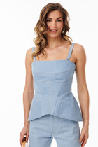 Блузка женская свободного А-силуэта из полупрозрачной блузочной ткани вуаль, длиной ниже уровня бедер, на притачных широких бретелях, регулируемых сзади с помощью «колец-протяжек». Спинка удлиненная, по низу блузки притачная широкая планка. Блузка на подкладке. Длина 67 см.