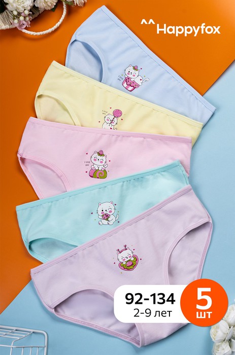 Трусики слипы для девочки выполнены из гипоаллергенного хлопкового трикотажа. Трусы представлены в пастельных оттенках и украшены принтом Котик. В наборе 5 шт.