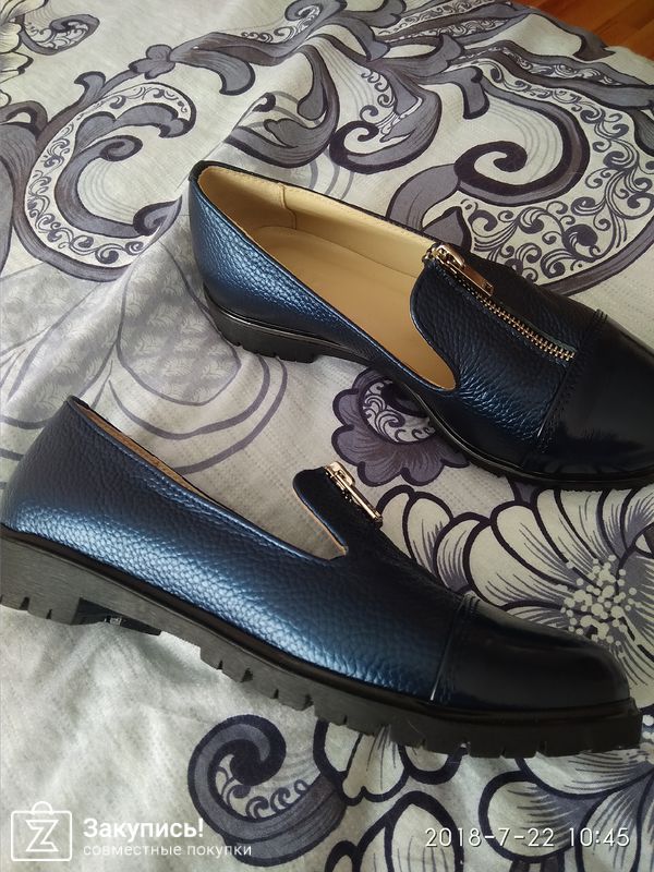 Заказывала из двух видов кожи: флотар сапфир ( основной цвет) и лак синий( нос). Подошву выбрала черную.