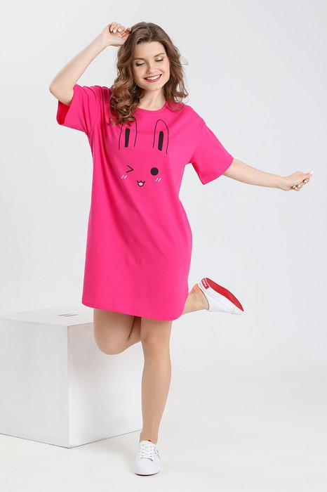 Туника молодежная из трикотажного полотна «кулирка» с набивным рисунком и принтом. Прямого силуэта, с коротким втачными рукавами, горловиной овальной формы, окантованной основным материалом, принт в технике «шелкографии» на полочке и фигурной линией низа.